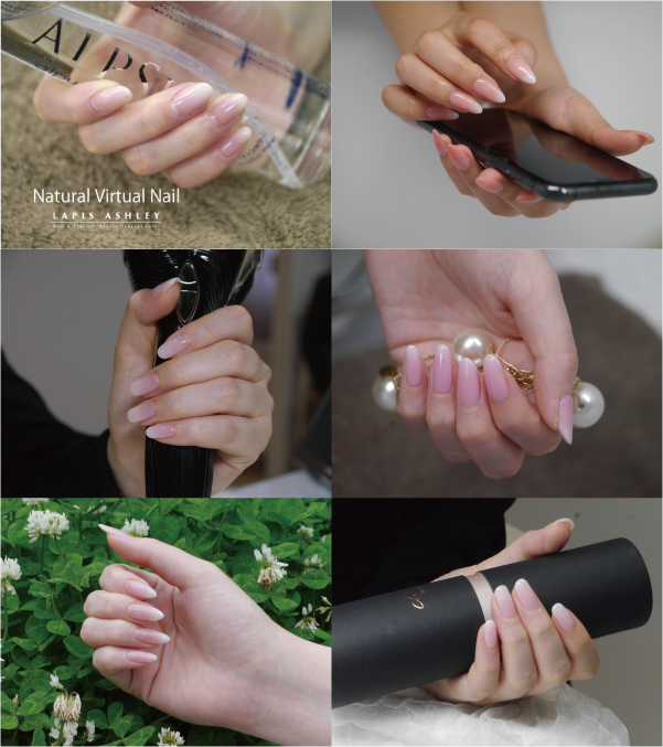 当店オリジナルのナチュラルバーチャルネイルはヌーディーカラーで自爪が透けて見える部分にエアブラシを使用し優しくカラーを施すことで、自爪の白とピンクの境目をぼかしワンカラーよりも自然な指長効果を演出いたします。